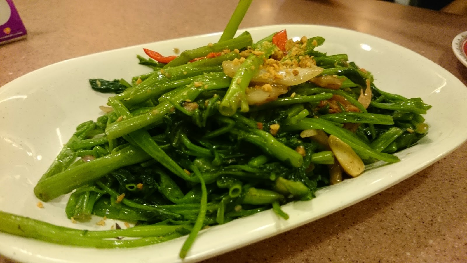 炒通菜加了蒜粒、洋蔥、椒絲,上菜前還灑上了花生碎,香味十足。