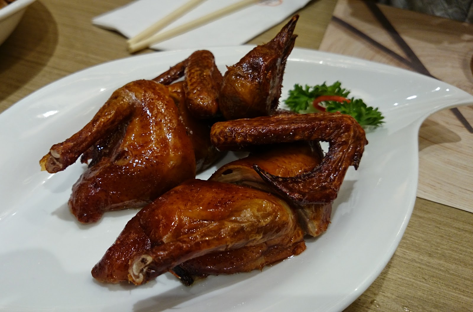 先把排骨炸香,再加上糖漿快炒,新鮮煮好就上菜,吃起來排骨仍很脆,酟上糖漿更減去油膩感。鹽香脆皮乳鴿 ($58)