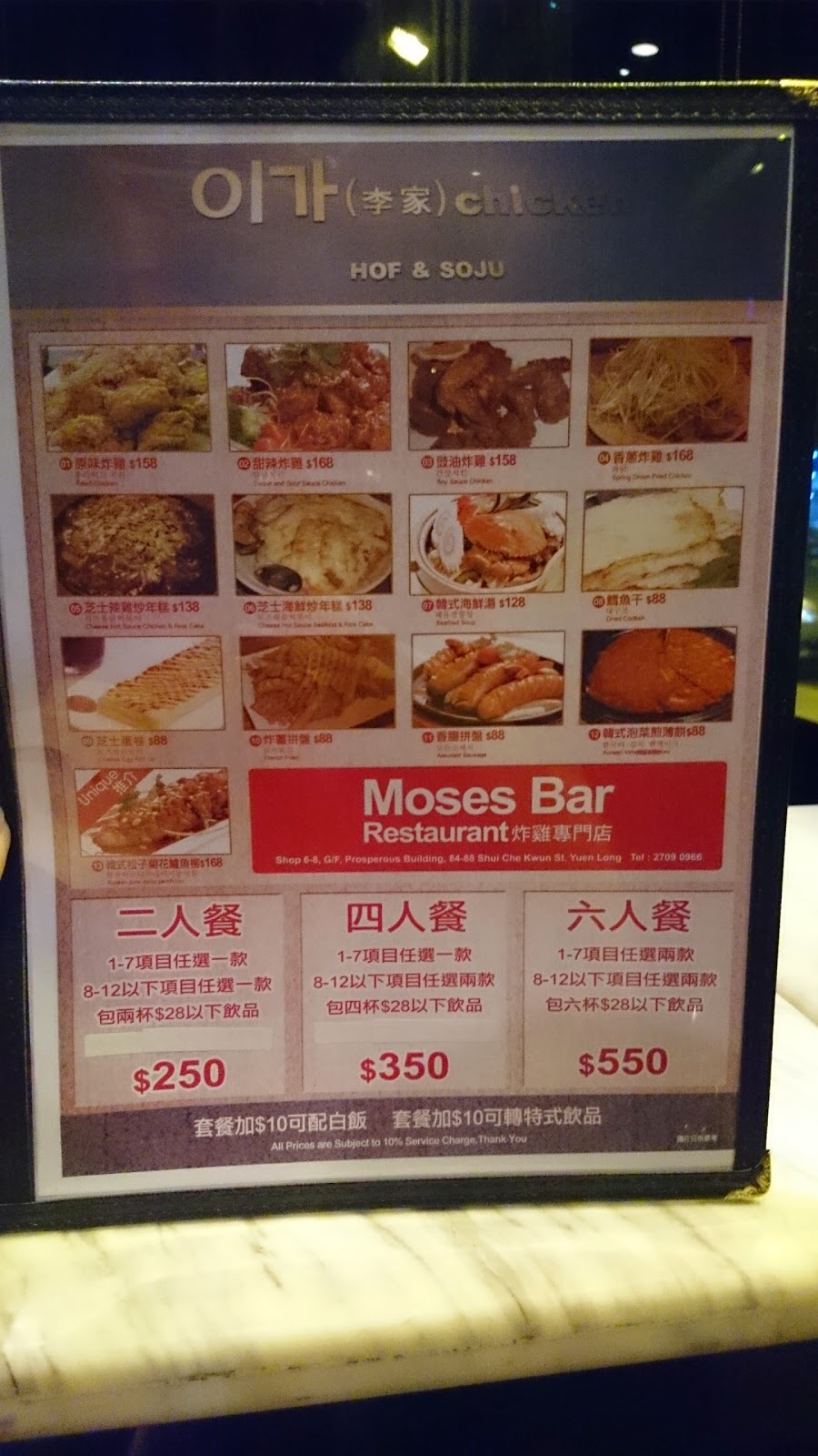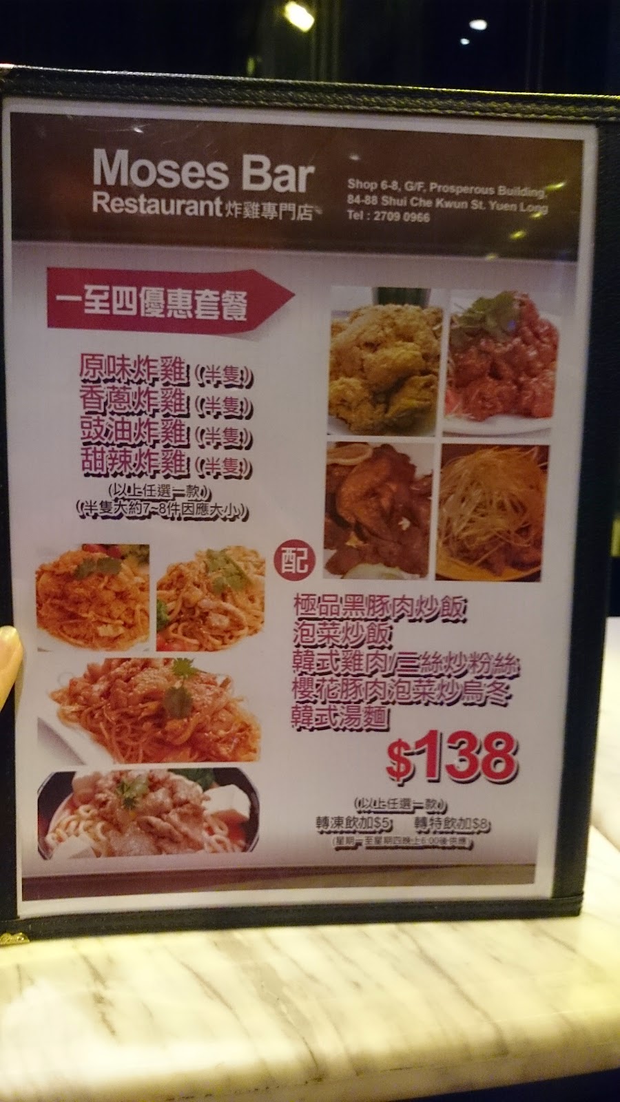 今天來到的是位於元朗的Moses Bar and Restaurant,雖然是酒吧,但賣點是李家炸雞 (灑碎花),從輕鐵站沿路走到餐廳,看到這個易拉架放在路旁,就知走對了。