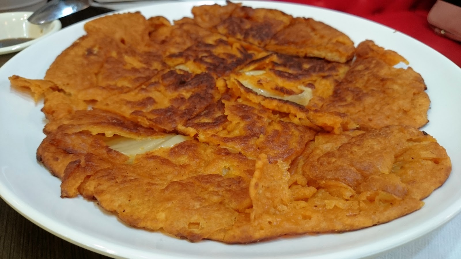 剛剛煎好熱辣辣,外層的麵粉皮金黃香脆,包著一大片的泡菜。