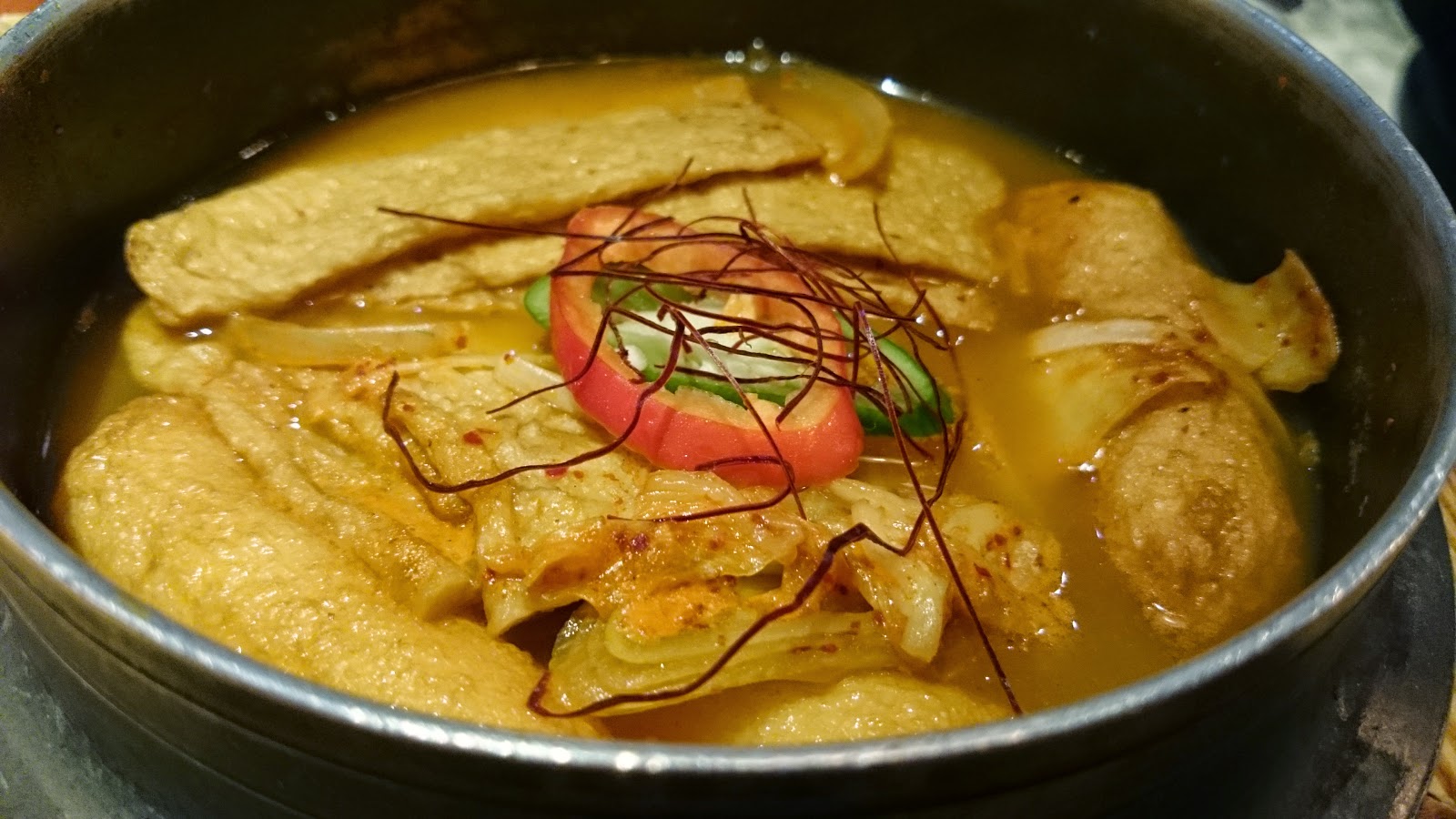 這個鍋帶微辣,內裡有年糕、油豆腐、韓式魚蛋、菜等等,比起先前那兩個就沒甚麼特別。