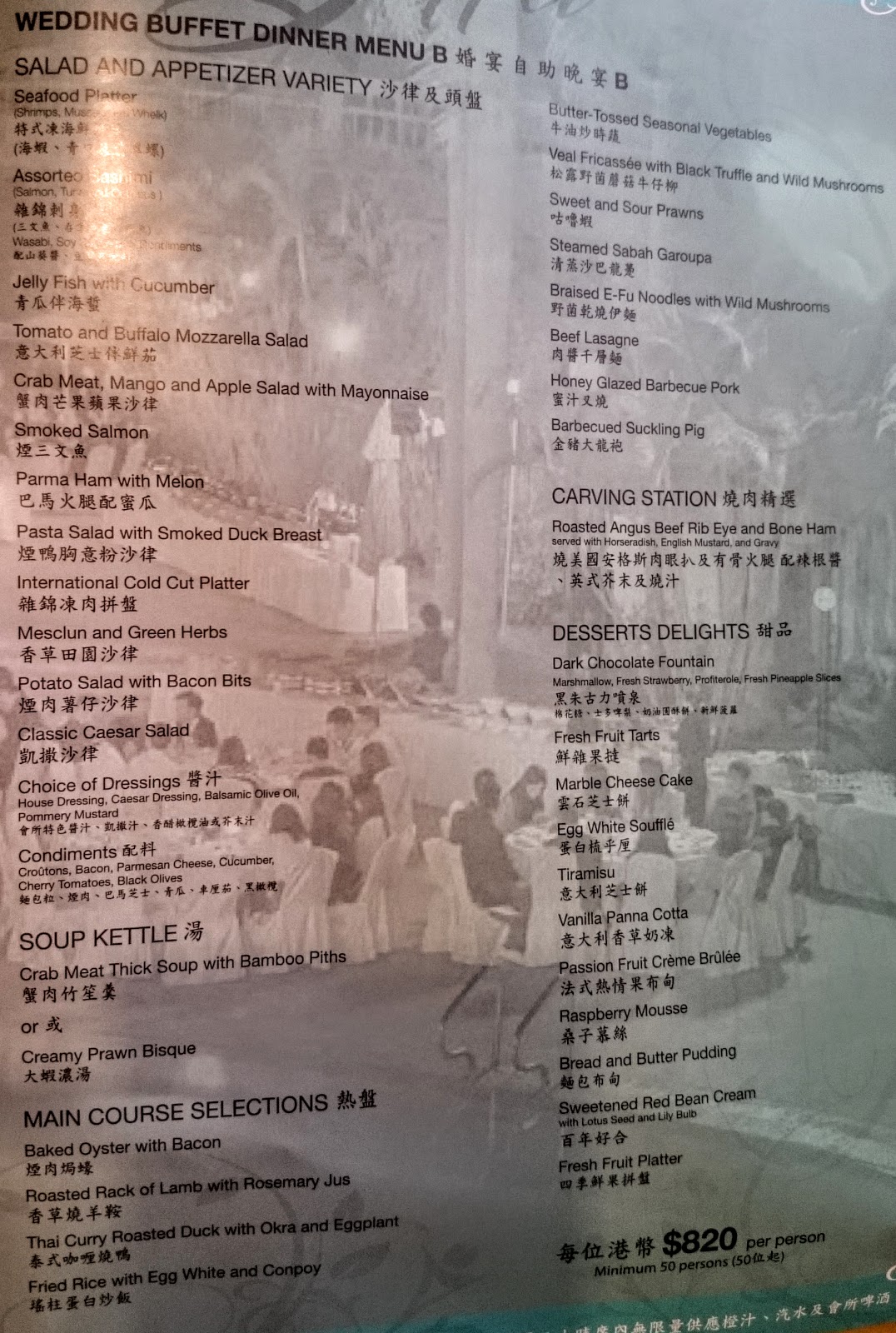 在這裡搞buffet wedding相對較貴,這裡有2個package,分別是$650 per head 和 $820 per head,同樣地另收10% service charge,酒水方面則$30 per head,有橙汁、汽水和啤酒。