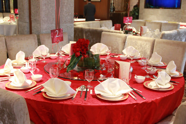 婚宴時主家席的大紅檯布及檯花。椅子十分舒服,不用加椅套已經很得體。