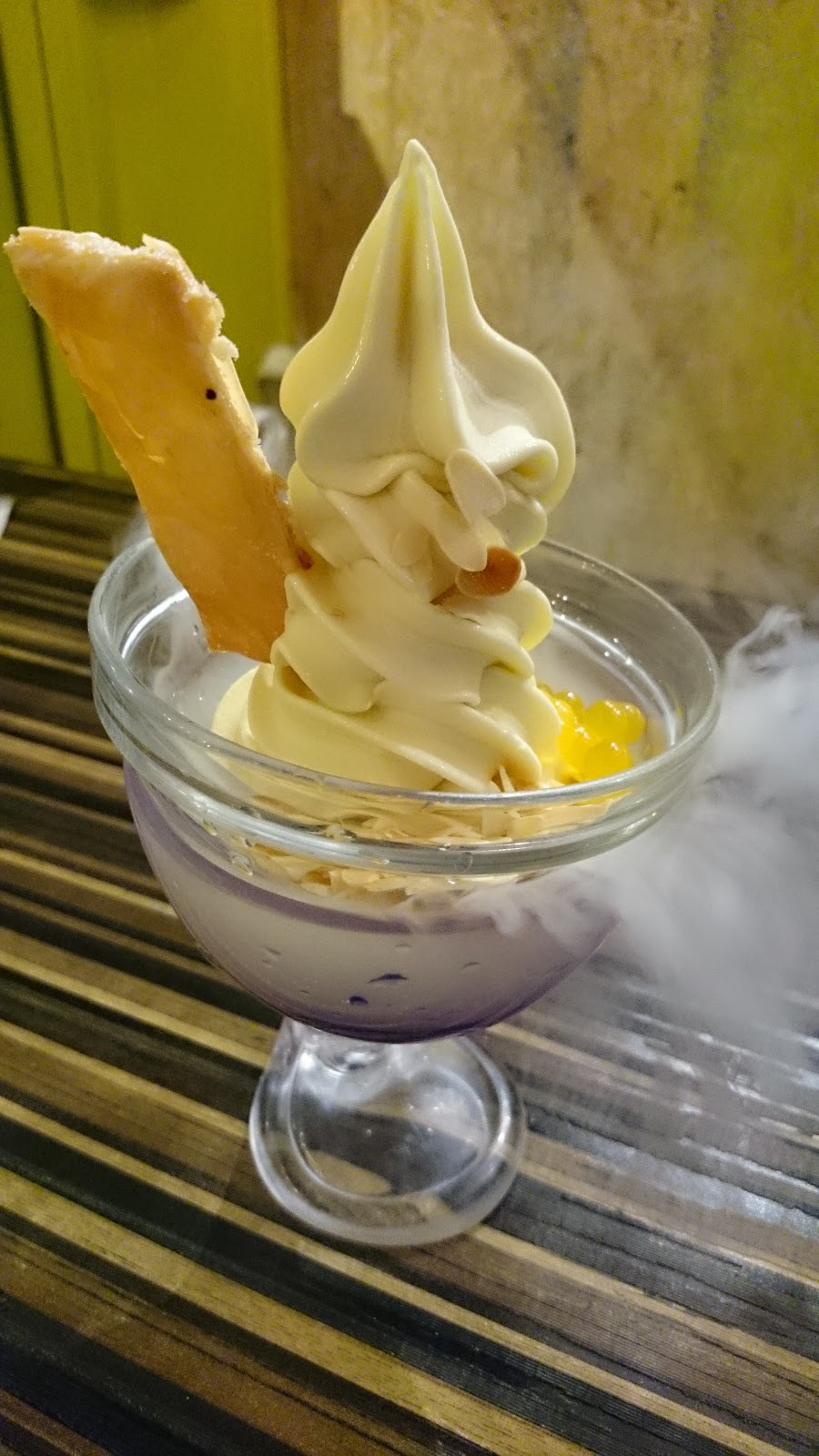 夢幻榴槤雪糕:榴槤味濃,口感幼滑,比外賣的榴槤雪糕多了爆珠、杏仁片,脆餅,配上幼滑的軟雪糕口感更豐富。用乾冰出煙霧效果,真的夢幻。