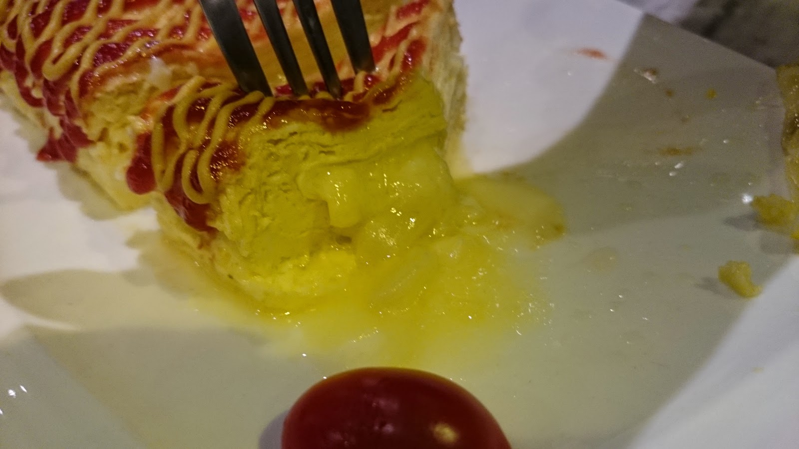 芝士蛋卷上唧滿茄油和千島醬,長度跟麵包店內的蛋卷差不多,看來平平無奇,可是一切開…