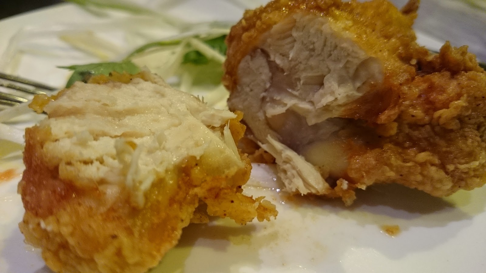 先說說炸雞,雞是剛剛炸起的,外皮香脆,未經烹煮過的香蔥剛好減卻了炸雞的油膩感。或許是整隻雞各部位都一次過拿去炸,吃起來有些雞件較嫩滑多汁,但雞胸等部份因肉質本來已不嫩滑,炸後吃起來那對比更嚴重。