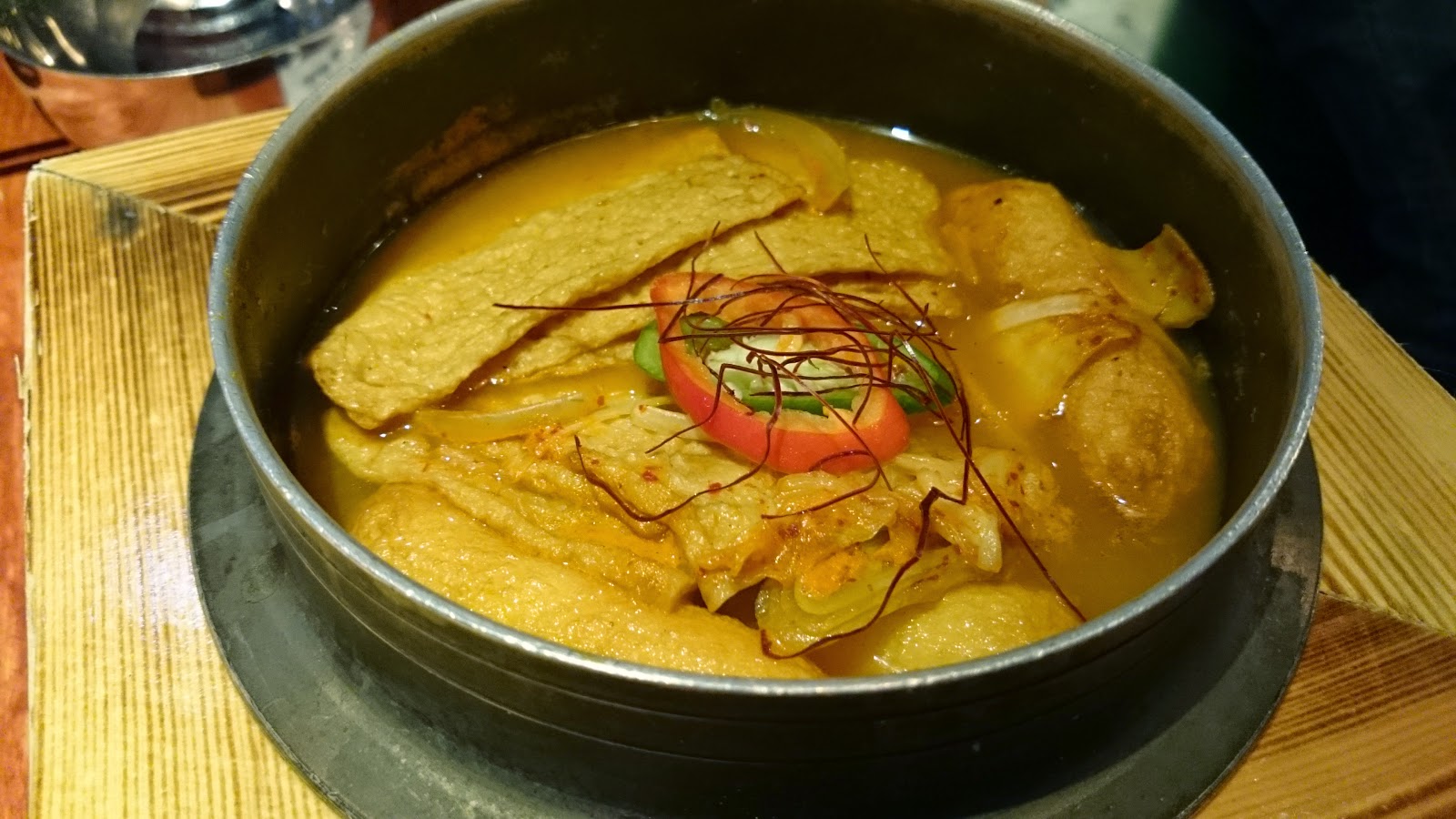這個鍋帶微辣,內裡有年糕、油豆腐、韓式魚蛋、菜等等,比起先前那兩個就沒甚麼特別。