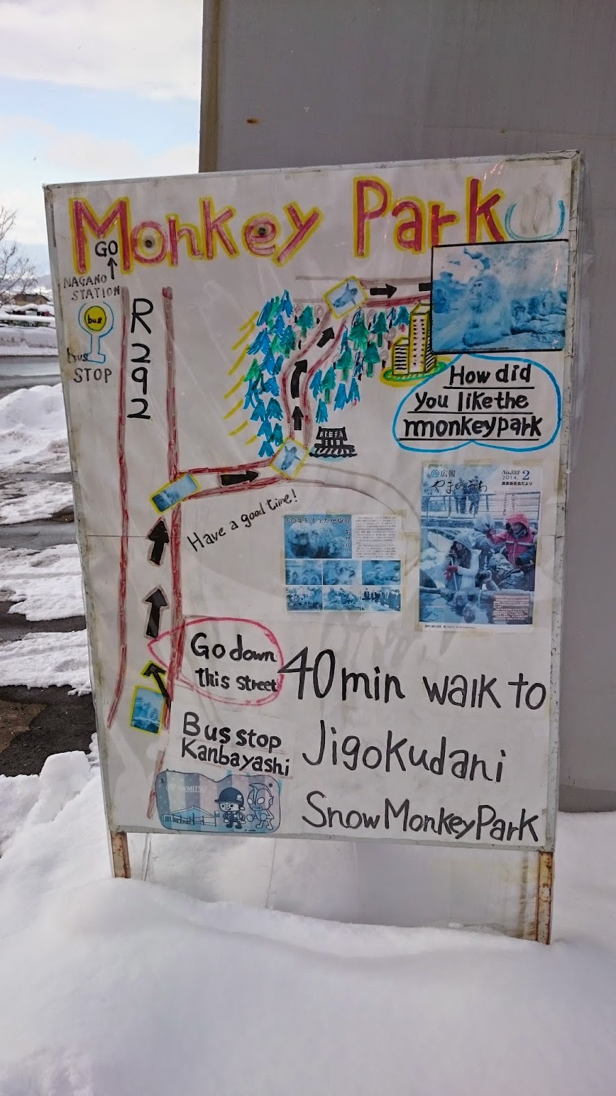 走了幾步,看到Monkey Park的路牌。沒錯,如果你想到「地獄谷野猿公苑」(Jigokudani Monkey Park / Snow Monkey Park) 的話,乘車到上林溫泉就沒錯。