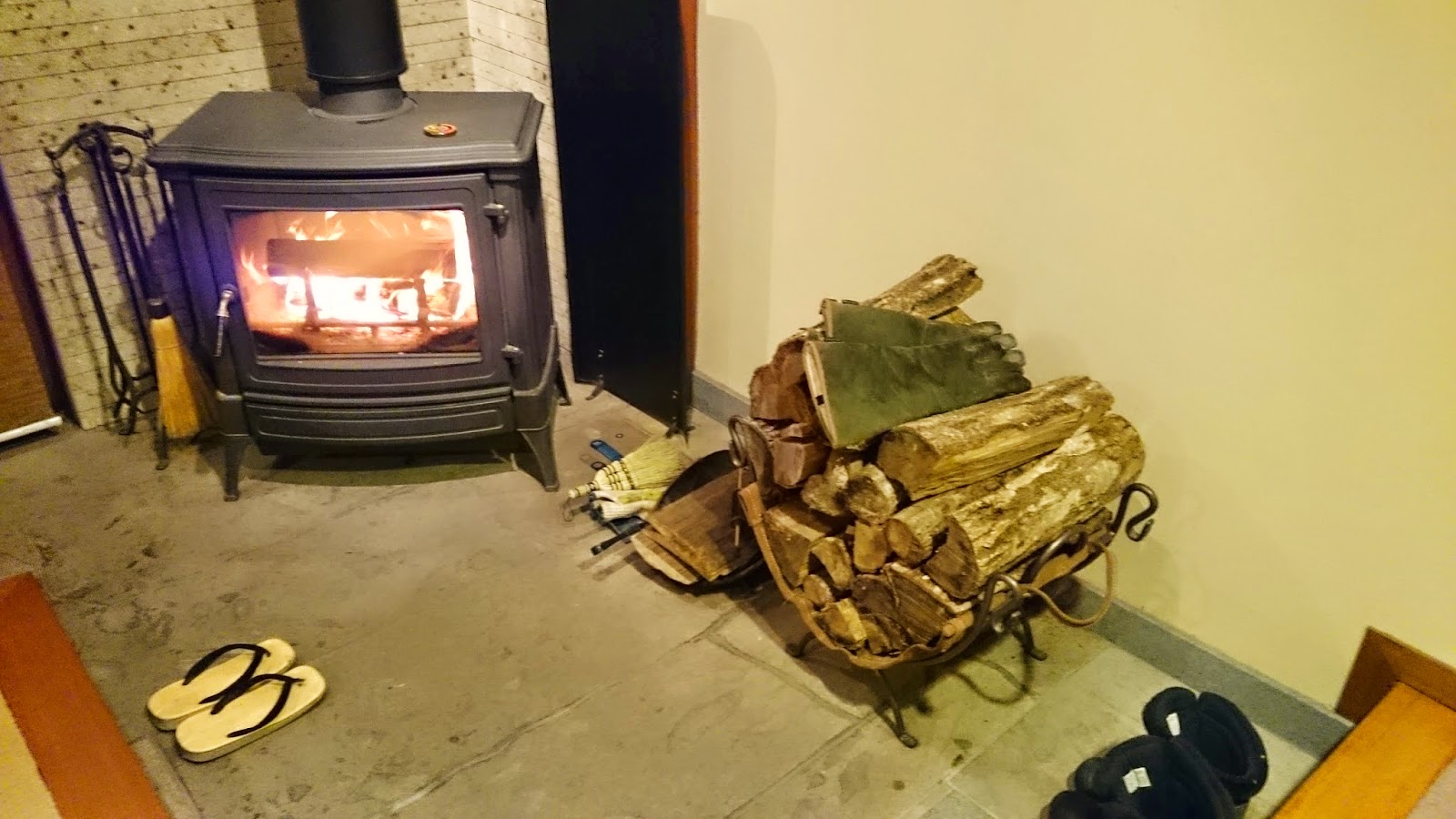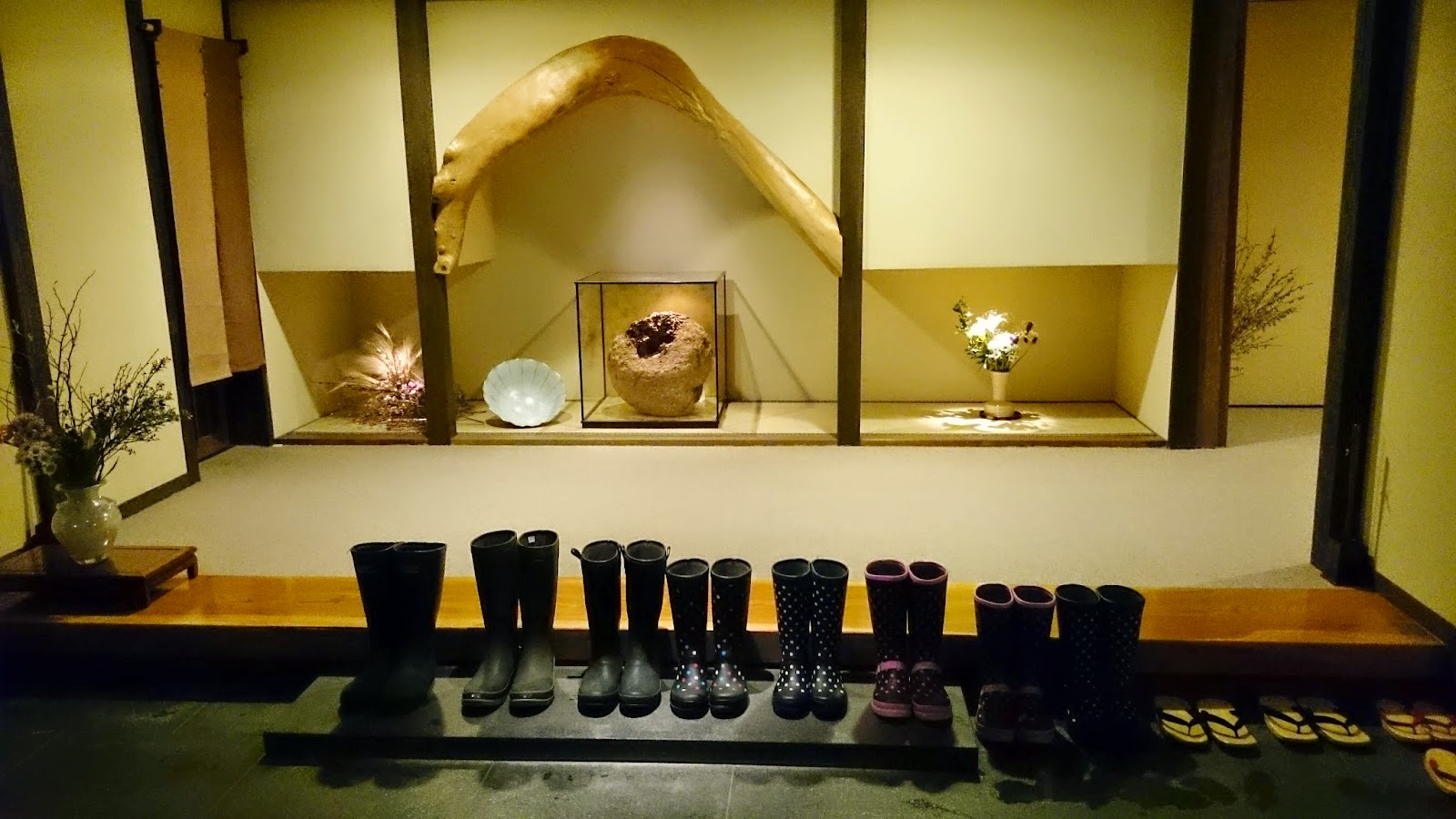 一踏進旅館,除了有穿著和服的職員迎接我們外,還有一排雨鞋,想必是讓客人借用吧。 不像我們以往住的溫泉旅館,這裡一踏進旅館玄關便要脫鞋,職員還會立刻把客人的鞋收起,給你換上拖鞋。